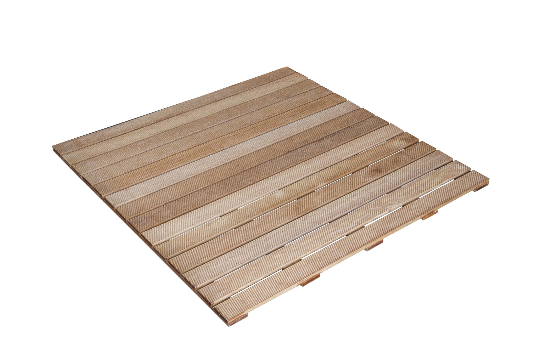 Deze tuintegel van hardhout met een zeer lange levensduur heeft een reliëf, is geschroefd heeft 16 latten boven en 4 latten onder (afmetingen latten: 12×55 cm. ). De tuintegel heeft de volgende afmetingen: 100cm x 100cm.