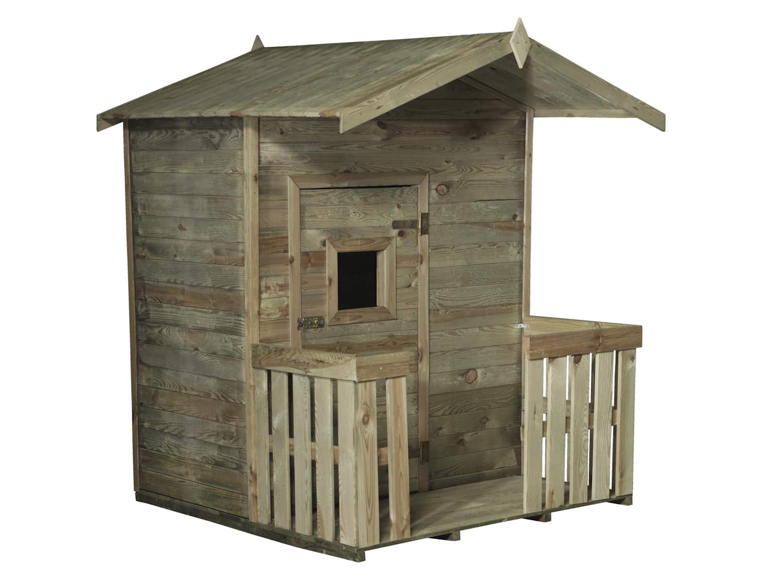 Dit naaldhouten kinderspeelhuisje met veranda is vacuümdruk verduurzaamd (geïmpregneerd), universeel overschilderbaar.