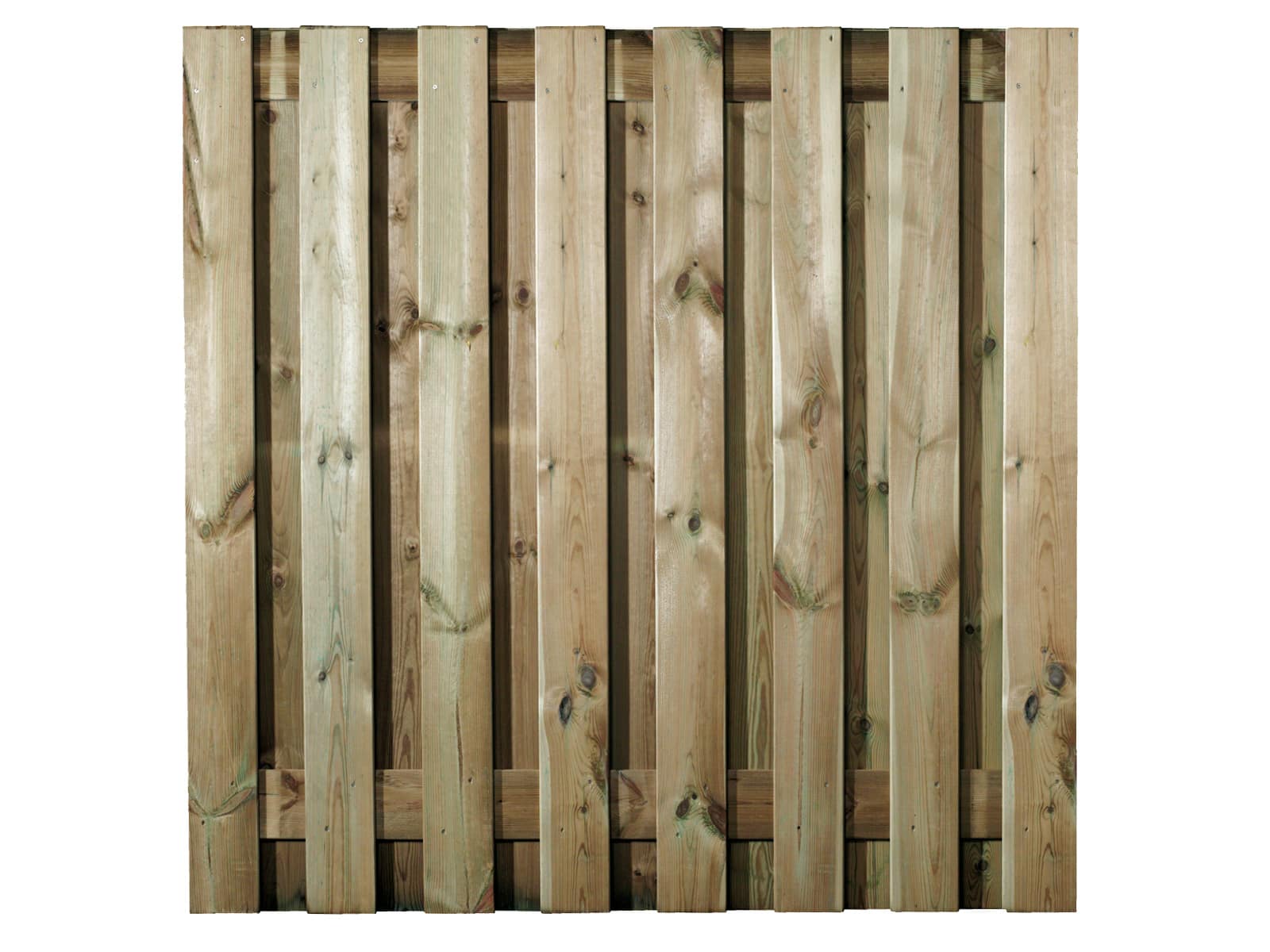 Dit naaldhouten scherm (schutting) is vacuümdruk verduurzaamd (geïmpregneerd), RVS geschroefd, 15 planken 15×145 mm, 2 planken als regels