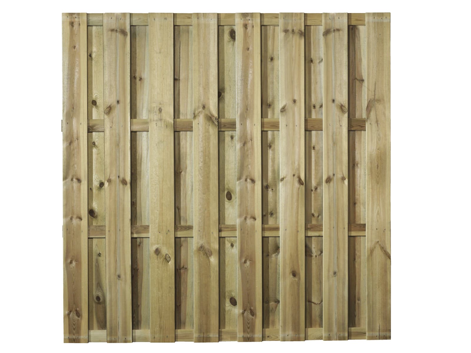 Dit naaldhouten scherm (schutting) is vacuümdruk verduurzaamd (geïmpregneerd), RVS geschroefd, 15 planken 14×140 mm, 4 regels 18×70 mm