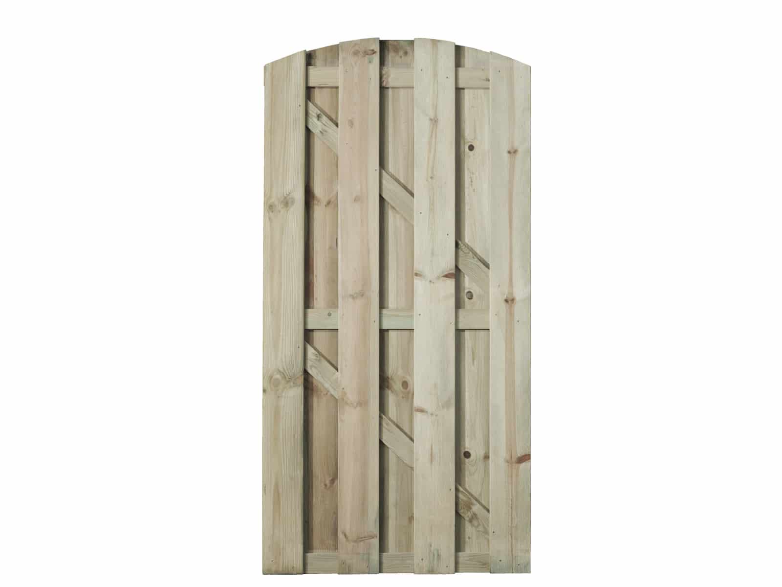 Deze naaldhouten deur (poort) is vacuümdruk verduurzaamd (geïmpregneerd), RVS geschroefd, 7 planken (verticaal bevestigd) 16×145 mm, 3 regels 18×70 mm, 2 schoren 18×70 mm
