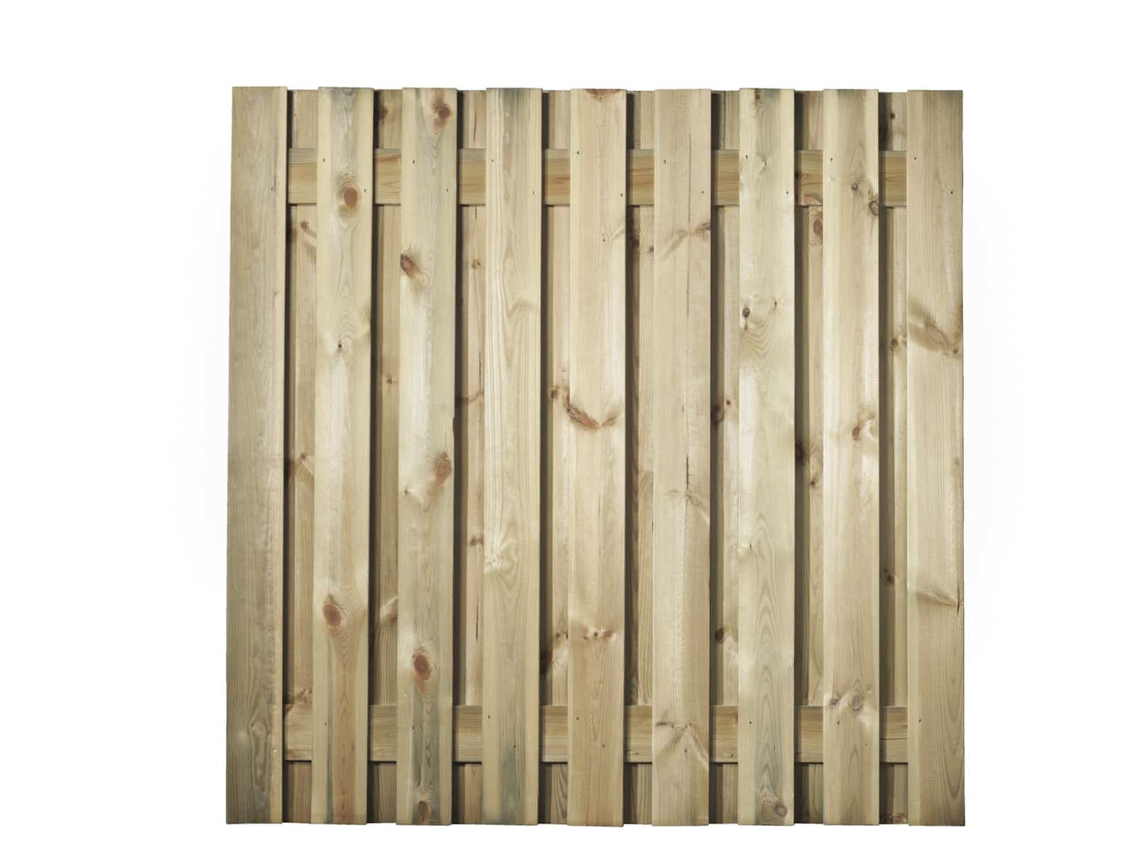 Dit naaldhouten scherm (schutting) is vacuümdruk verduurzaamd (geïmpregneerd), RVS geschroefd, 17 planken 15×145 mm, 2 planken als regels