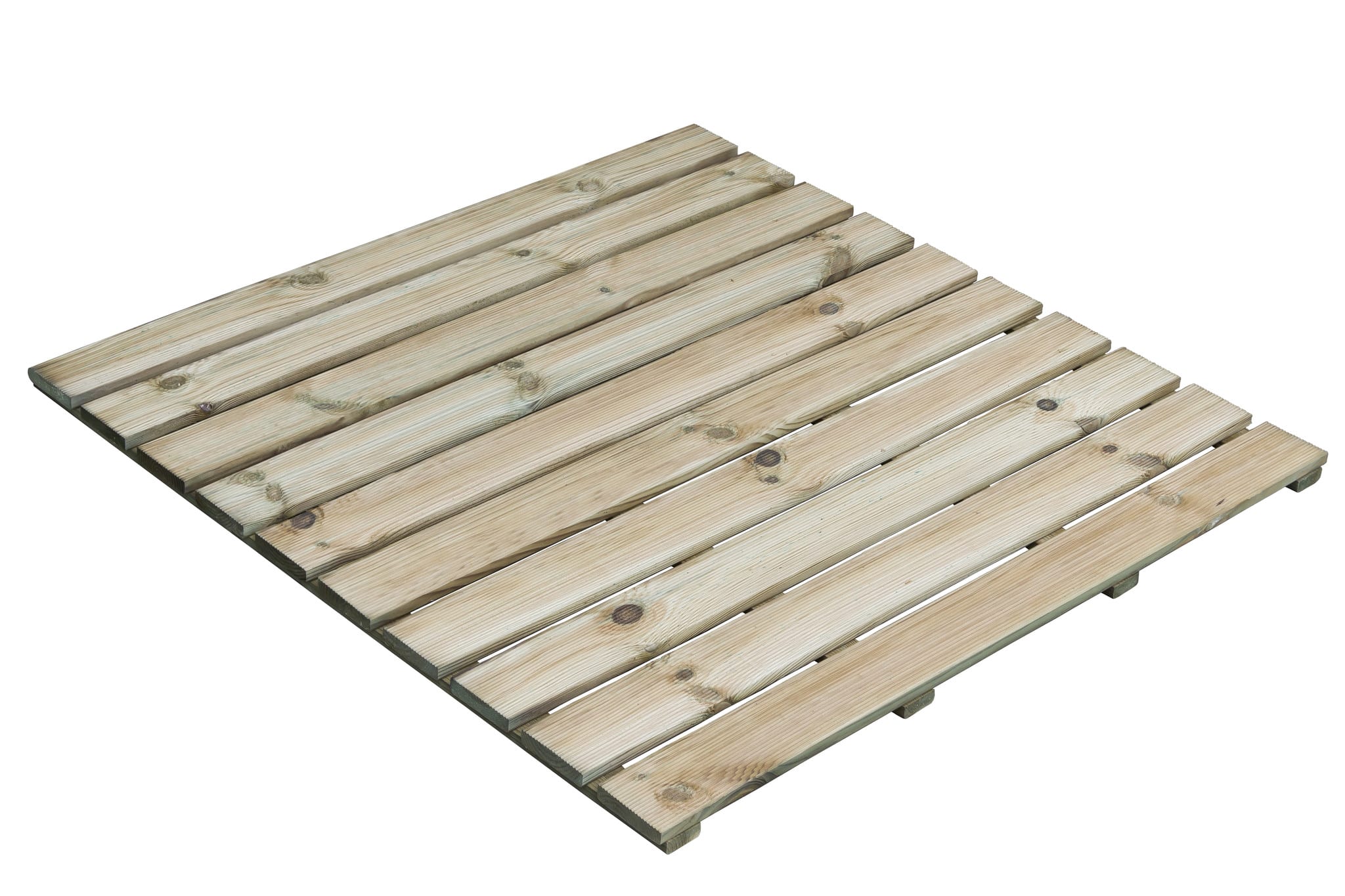 Deze naaldhouten tuintegel is vacuümdruk verduurzaamd (geïmpregneerd) en heeft 10 latten boven (afmetingen: 16×90 mm) en 4 latten onder (dikte latten: 16 mm), latafstand: ca. 12 mm. De afmeting van de tegel is 100cm x 100cm.