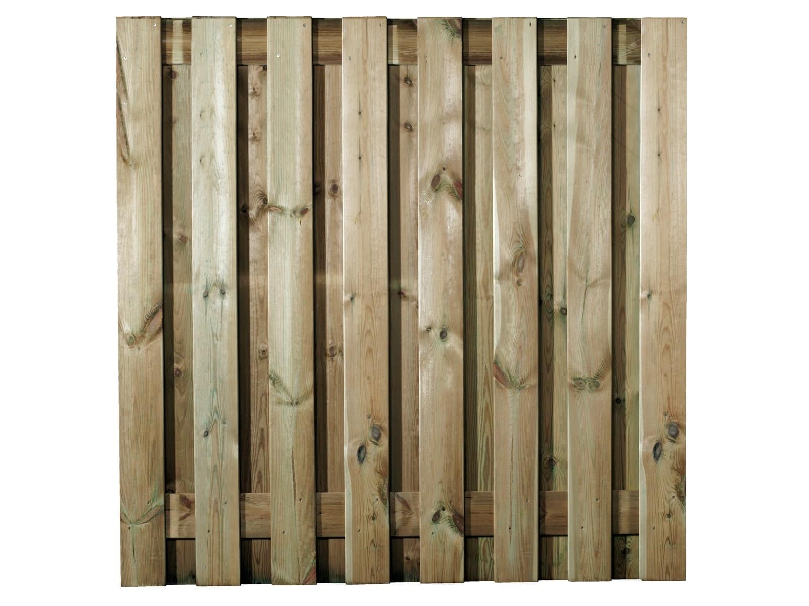 Dit naaldhouten scherm (schutting) is vacuümdruk verduurzaamd (geïmpregneerd), RVS geschroefd, 15 planken 15×145 mm, 2 planken als regels
